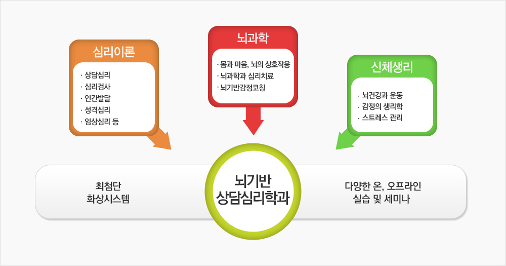뇌기반상담심리학과는 뇌과학에 기반한 상담 및 코칭에 관한 이론과 실무를 겸비한 교육과정을 구성하고 있습니다. 기초과정, 발달과정, 심화과정을 통해 전문성 함양 및 다양한 국가 자격증과 민간 자격증을 취득할 수 있고, 졸업 후 자격증과 연계하여 전문가로 활동할 수 있으며 다양한 분야의 강사활동을 지원하고 있습니다.